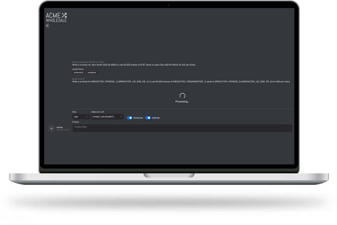 In-line, on the fly redaction of sensitive data prevents confidential information from leaving your network via user prompts.